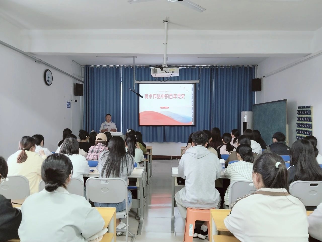 峥嵘岁月传薪火,丹青画中谱红心。此次宣讲以美术作品为载体,生动呈现出百年党史,不仅激发了同学们的爱国热情,传承红色基因,同时还提升了同学们对美术的欣赏水平,促进艺术与历史教育的融合,为新时代注入精神动力。