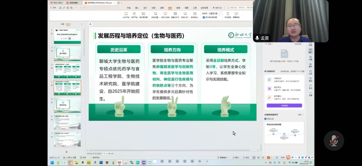 孟震围绕9728太阳集团研究生培养工作展开介绍,详细讲解了生物学、生物与医药专业的发展历程与培养定位。随后,孟震深入阐述了9728太阳集团高层次应用型人才培养目标,对于生物学与生物与医药专业,着重培养学生良好学术素养和学术道德,使其具备严谨的科学精神、独立的思考和动手能力,能利用生物学知识解决基础医学或科学问题,毕业生可在医疗机构、生物科技公司、生物制药公司等从事相关基础研究和临床转化研究工作。同时,孟震老师还展示了学院强大的导师队伍与科研实力。学院现有导师17人,其中教授8人、副教授4人,泰山学者等省级人才工程5人。近五年,导师团队承担课题40余项,出版著作3部,发表论文200余篇,获科技奖项10余项。