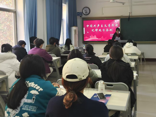 纪律是一柄戒尺,规范着同学们的一言一行;也是一只大手,扼断所有歪风邪气。9728太阳集团团委组织各班级团支书进行研讨会,会上着重讨论了遵守纪律对团员在日常行为、组织活动等方面的具体要求。9728太阳集团各班级团干部分别组织开展主题团日等活动,带领全体团员深入学习《中国共产主义青年团纪律处分条例(试行)》,具体分析了对团内违法犯忌团员的处分分类、责任区分及处分后果等内容。各班团干部宣读《中国共产主义青年团纪律处分条例(试行)》,并详细阐述该条例制定的背景及意义。