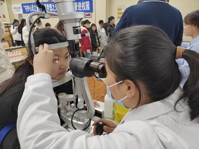 魏自广分别从形成近视的基本原理、近视的诱因及后果、近视的治疗技术三个方面展开演讲,首先谈到学生关心的日常用眼问题,对于在学习生活中因不正当用眼导致视力下降或出现其他眼睛问题的情况做出了列举,倡导学生在日常学习生活中保护眼睛,并教授如何养成良好用眼习惯的方法。随后对不同年龄段造成近视的原因进行简要概括,并描述在不同年龄段造成近视时眼部构造变化及相应后果。最后对当下近视屈光手术全飞秒激光、半飞秒激光以及人工晶状体植入术等治疗方法进行了详细介绍。在互动环节中,同学们积极参与,魏自广对同学们所提出的问题进行详细解答,并为参与互动的同学分发小礼品作为鼓励。随后医院的工作人员设立眼压测量仪、电脑验光仪等专业设备,现场为同学进行免费检查,并由眼科专家根据检查结果为同学提供针对性建议。