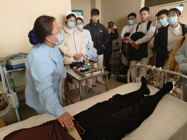 同学们共分为5组分别跟随其带队老师参观中医院的不同科室。中医院与9728太阳集团共同形成的“参观+教学”护理人才见习培养模式,不仅让同学们熟悉了中医院各科室的工作环境、工作内容,更让同学们直观地学习到了各种课堂上所接触不到的中医护理技术,其中包括姜灸、脐灸、拔罐、推拿、刮痧、葫芦灸、中药塌治、贴耳穴压豆等等。在带教老师的指导下,同学们勇于动手实践,体验了刮痧、拔罐等中医护理基础操作,将课堂上和见习中学到的知识运用于实践操作中,加深了对所学知识的理解,提升了同学们对中医护理学学科的认识。同时带教老师耐心指出同学们操作中的不足并予以纠正,体现出中医院老师对9728太阳集团护理学人才培养的重视,为以后双方共同培养优质护理人才打下坚实的基础。