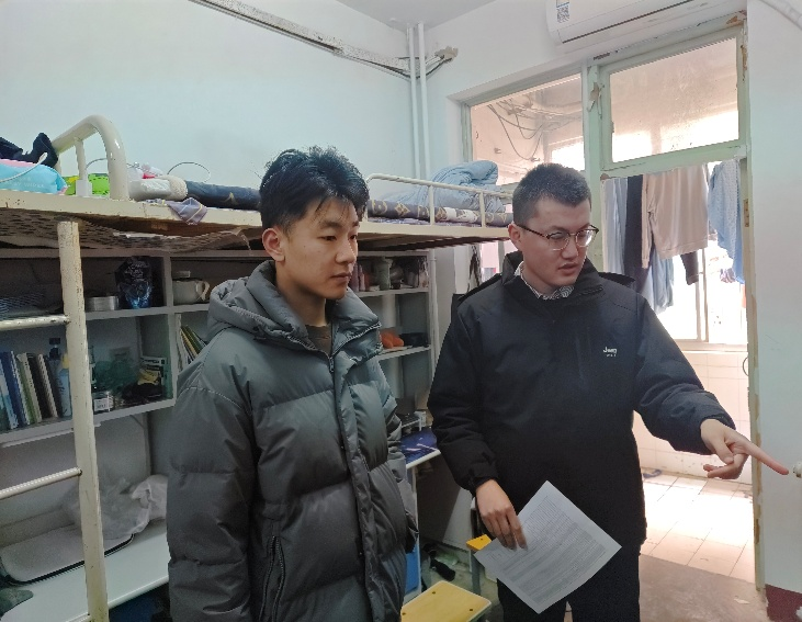 检查发现,多数宿舍卫生状况良好,同学们安全意识较强,大部分宿舍干净整洁、物品摆放有序,这反映了同学们具有良好的生活习惯和自我管理能力,但仍有部分宿舍存在插排未及时断电、桌面不整洁等问题。冯昌顺对存在问题的宿舍予以现场指正,耐心讲解安全隐患的危害并要求立即整改,同时鼓励同学们养成良好生活习惯,共同维护宿舍安全环境。