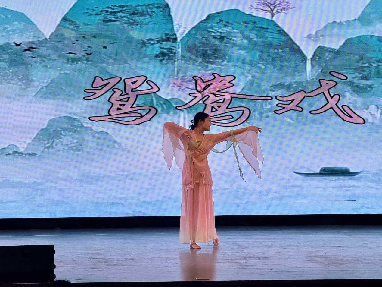 旋律流转间,灯光聚焦于李欣雨的舞蹈《鸳鸯戏》,让现场氛围愈发热烈。她身姿轻盈灵动,随着乐曲起落,舞步舒展流畅,每一个转身、每一次抬手都精准契合节奏,将“鸳鸯戏水”的灵动意境诠释得淋漓尽致。旋转时裙摆翻飞如流云,俯身时姿态温婉如静水,柔美中透着灵动,韵味十足。李欣雨将传统意境与青春活力相融,为现场献上了一场极具美感的视觉盛宴。
